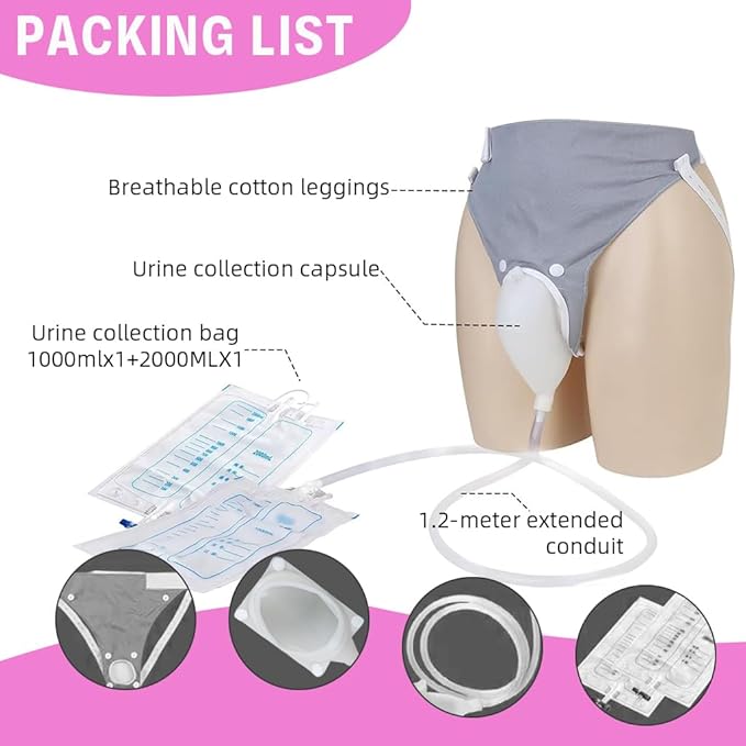 CONVENIENT TO USE: The wearable urine collector set is designed with convenience in mind. Its simple wearing style, similar to wearing underwear, allows the user to move freely without worrying about wetting their clothes or causing other disturbances. This design is especially friendly to those who need to change the diaper bag frequently.