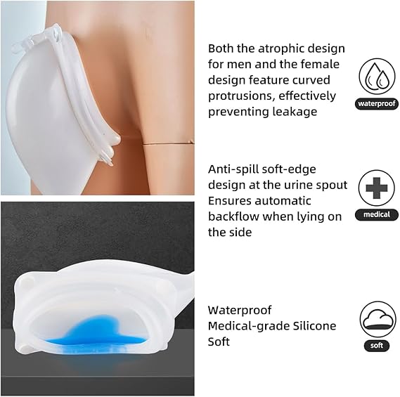 Overflow Prevention: The urinal's spill-proof soft-edge design at the urine spout prevents overflow, even when lying on the side. The urine naturally flows back into the urinal when it comes into contact with the soft edge