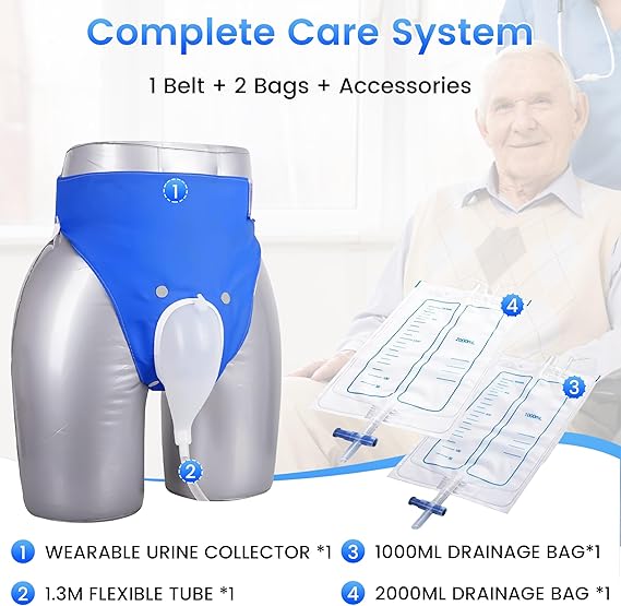 Urine bag collector set includes 1 urine connector, 1 pair of pants, 2 high quality padded 1000ml bags and 2000ml bags